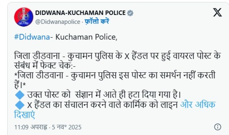 मामले की गंभीरता को देखते हुए देर शाम डीडवाना-कुचामन पुलिस ने अपने आधिकारिक अकाउंट से आधिकारिक स्पष्टीकरण जारी किया। पुलिस ने कहा “हम उक्त राजनीतिक पोस्ट का समर्थन नहीं करते हैं। यह गलती किसी व्यक्ति विशेष की चूक या तकनीकी कारण से हुई है। पोस्ट को तत्काल हटा दिया गया है।”
