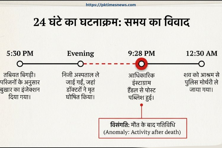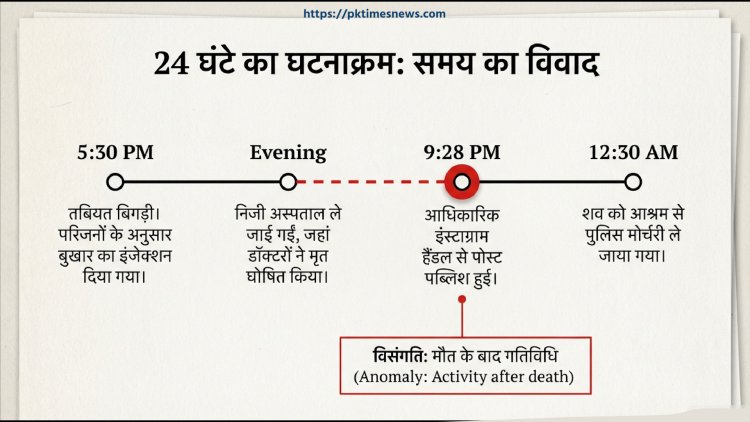 इमेज में घटना से जुड़े 24 घंटे का टाइमलाइन दर्शाया गया है, जिसमें इलाज, मौत की घोषणा और सोशल मीडिया गतिविधि के समय को लेकर गंभीर विसंगतियां सामने आई हैं