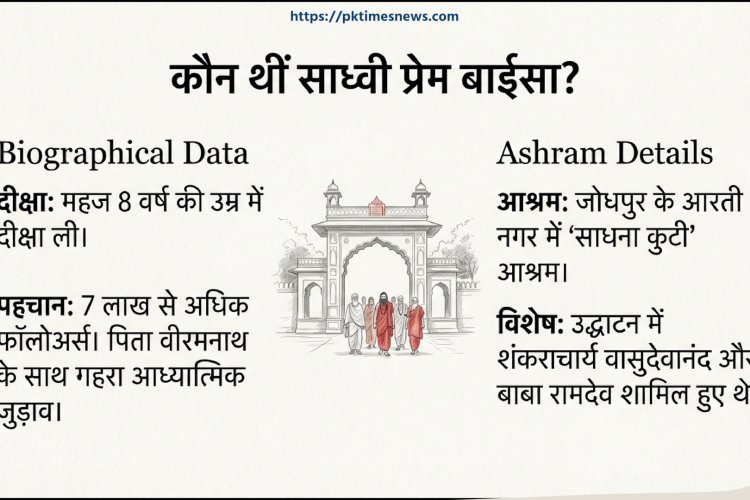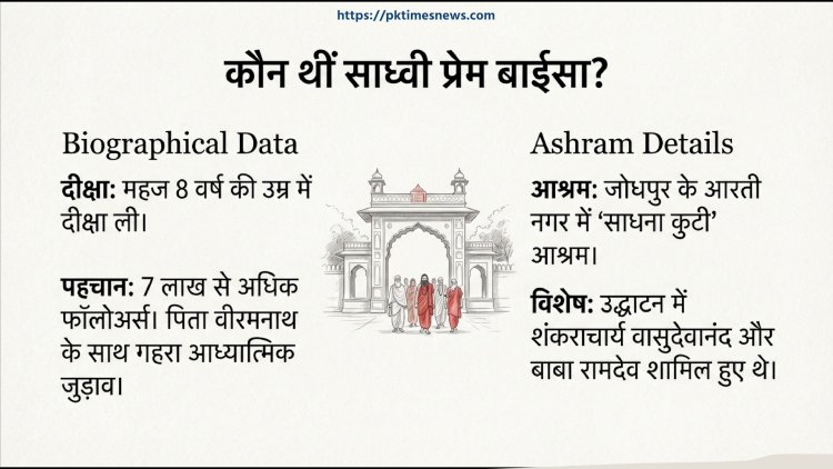 यह इमेज साध्वी प्रेम बाईसा के जीवन परिचय, आध्यात्मिक दीक्षा, सोशल मीडिया प्रभाव और जोधपुर स्थित आश्रम से जुड़े तथ्यों को संक्षेप में प्रस्तुत करती है।